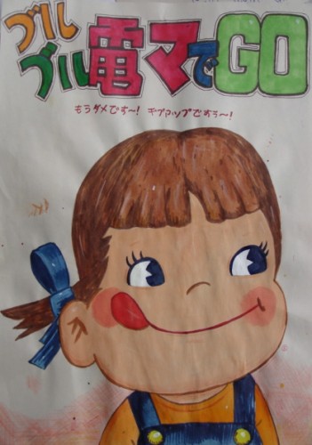 One of my first drawings made in Japan. The girl is my good old friend Fujiya Peko Milky mascot. The text is from Sugar Street, a pornographic magazine that specializes in used panties. It's very Japanese, I think.