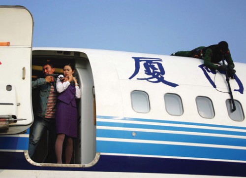 A Chinese policeman tries to rescue a flight attendant held by a hijacker during an anti-terror drill at a Xiamen airport.